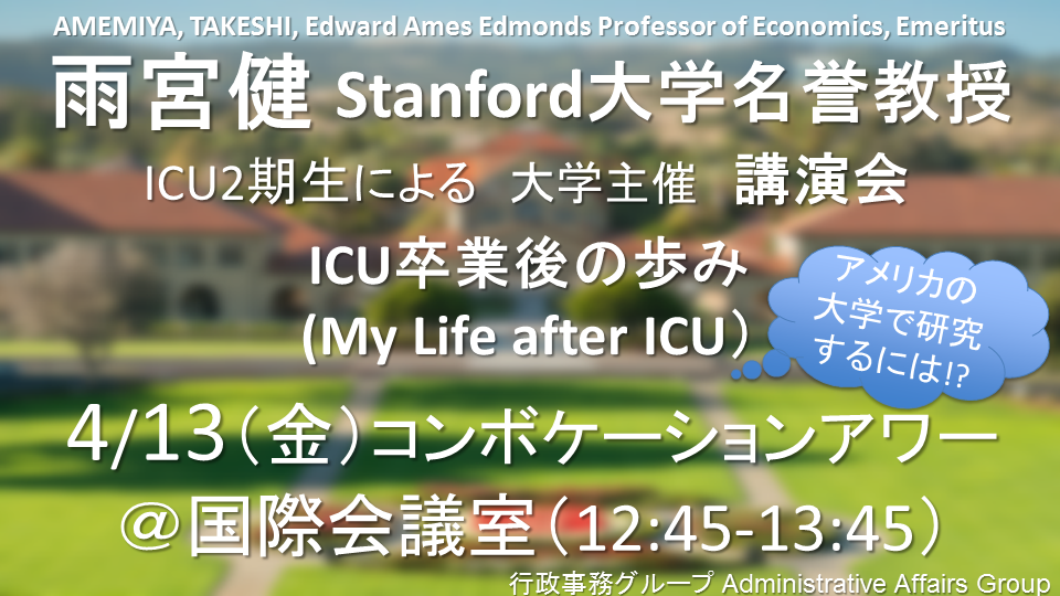 ICU2期生(1954年ご入学)で、著名な計量経済学者の雨宮健(あめみやたけし)スタンフォード大学名誉教授が、学生・教職員のために講演をしてくださることになりました。どうぞ奮ってご参加ください。