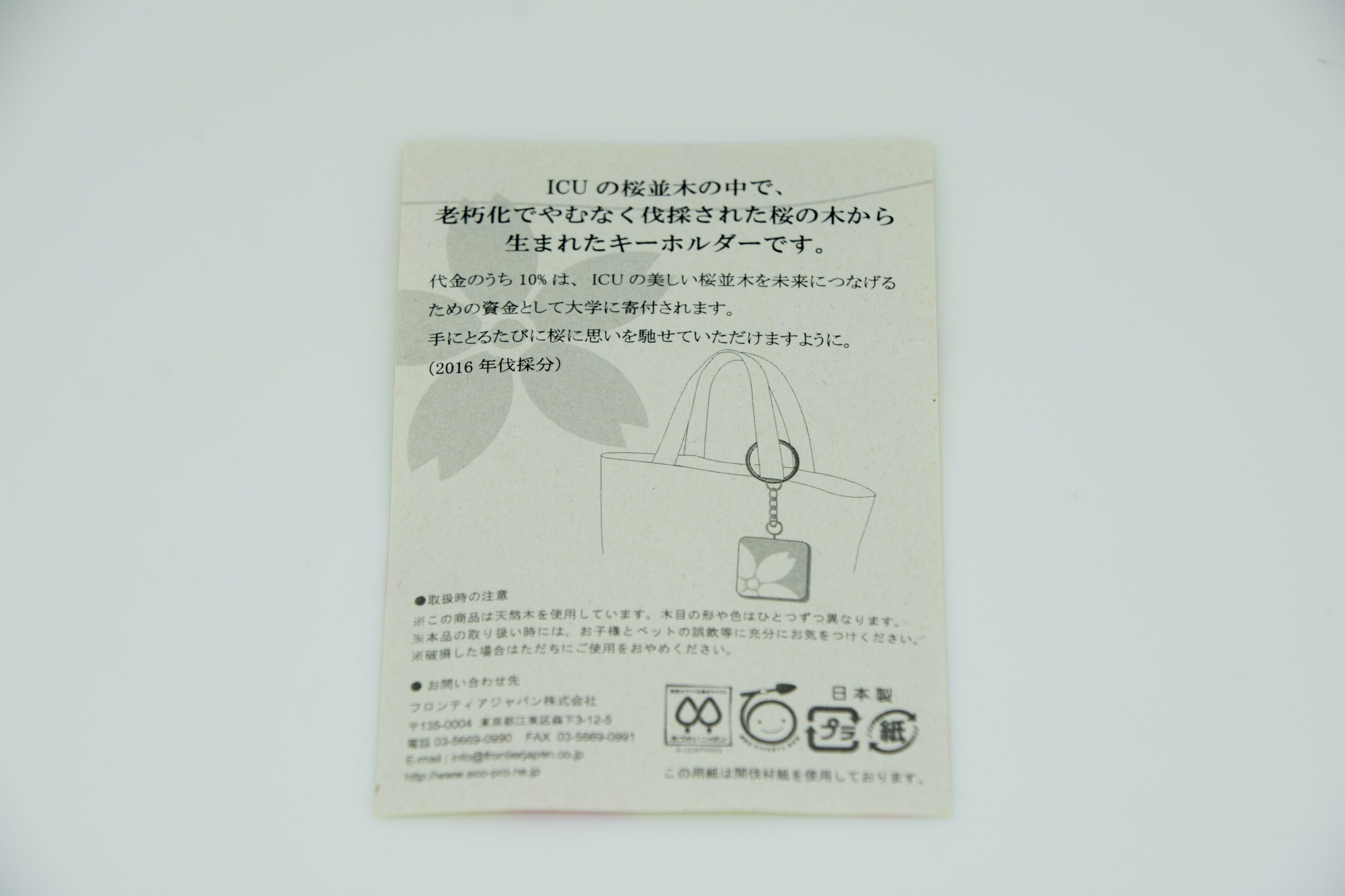 MISSION ホーム / ミッションと活動内容 / 同窓会グッズ / ICUの桜材キーホルダー ICUの桜材キーホルダー 桜グッズ 450円 桜材部分 3cm×3cm。 売上の一部が大学への寄付となります。