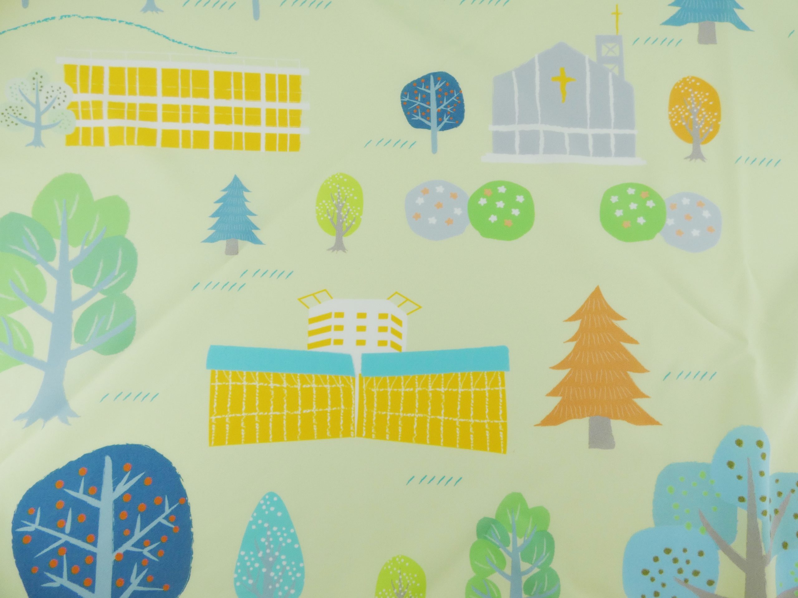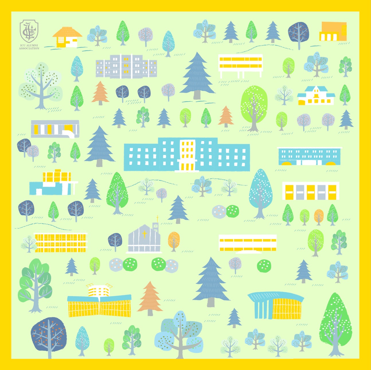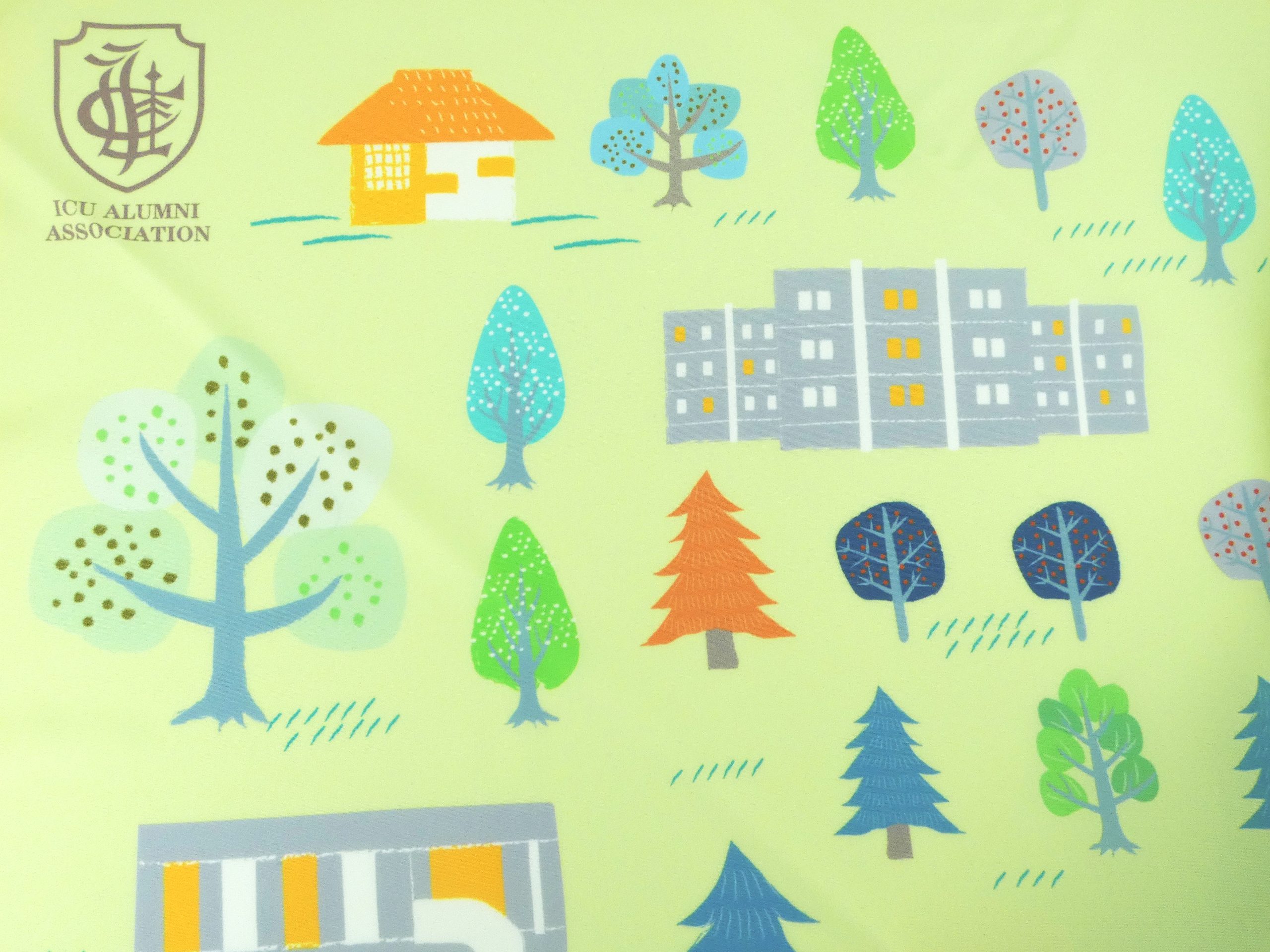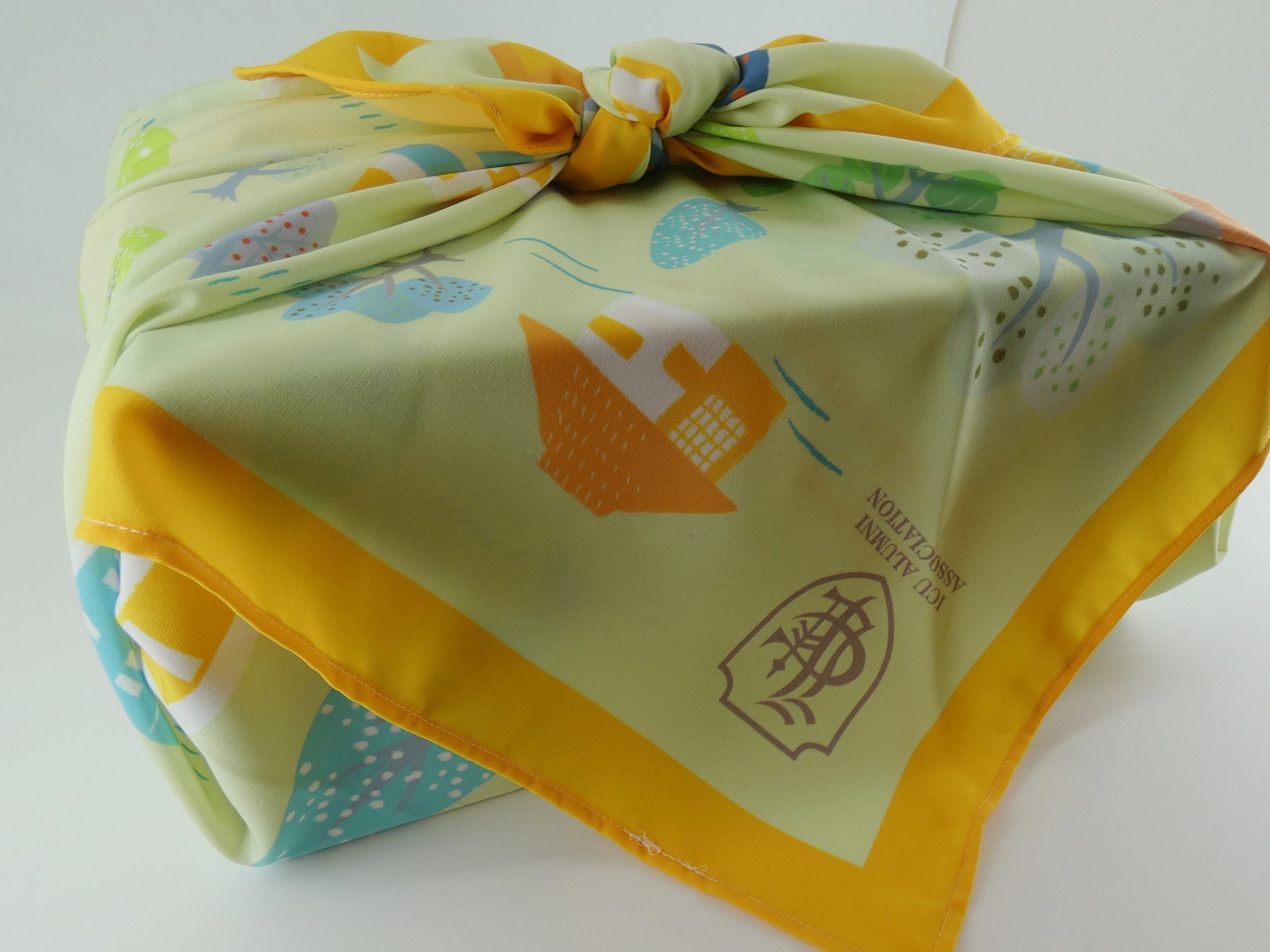 懐かしい風景や新たな建物が描かれた「オリジナルキャンパスマップ」柄の「超撥水」の風呂敷が誕生しました。デザインをしてくださったのは同窓生の中村麻衣子さん(47 ID03)です。大きさは96cm角。気持ちも明るくなるような鮮やかなカラーリングにしていただきました。
