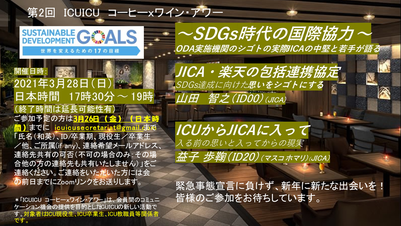 ICUICUの会*がICU在学生の皆さん向けにオンラインイベント第2弾を開催します。題して「〜SDGs時代の国際協力〜 ODA実施機関のシゴトの実際JICAの中堅と若手が語る」。緊急事態宣言に負けず、新たな出会いを!皆様のご参加をお待ちしています。