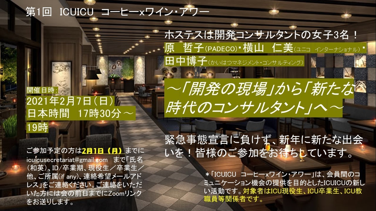 国際協力に関連の深い同窓生の組織、ICUICUの会*がICU在学生の皆さん向けにオンラインイベントを開催します。登壇者は「開発コンサルタント女子」3名!