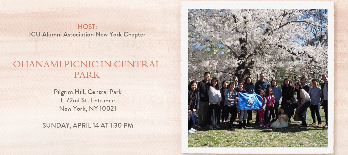 春分の日を迎えたものの、まだ朝夕氷点下になることも多い毎日ですが、みなさまお元気でお過ごしでしょうか。同窓会ニューヨーク支部は、今年も4月14日・日曜日の午後1時半よりセントラルパークにてお花見の会を開催いたします。