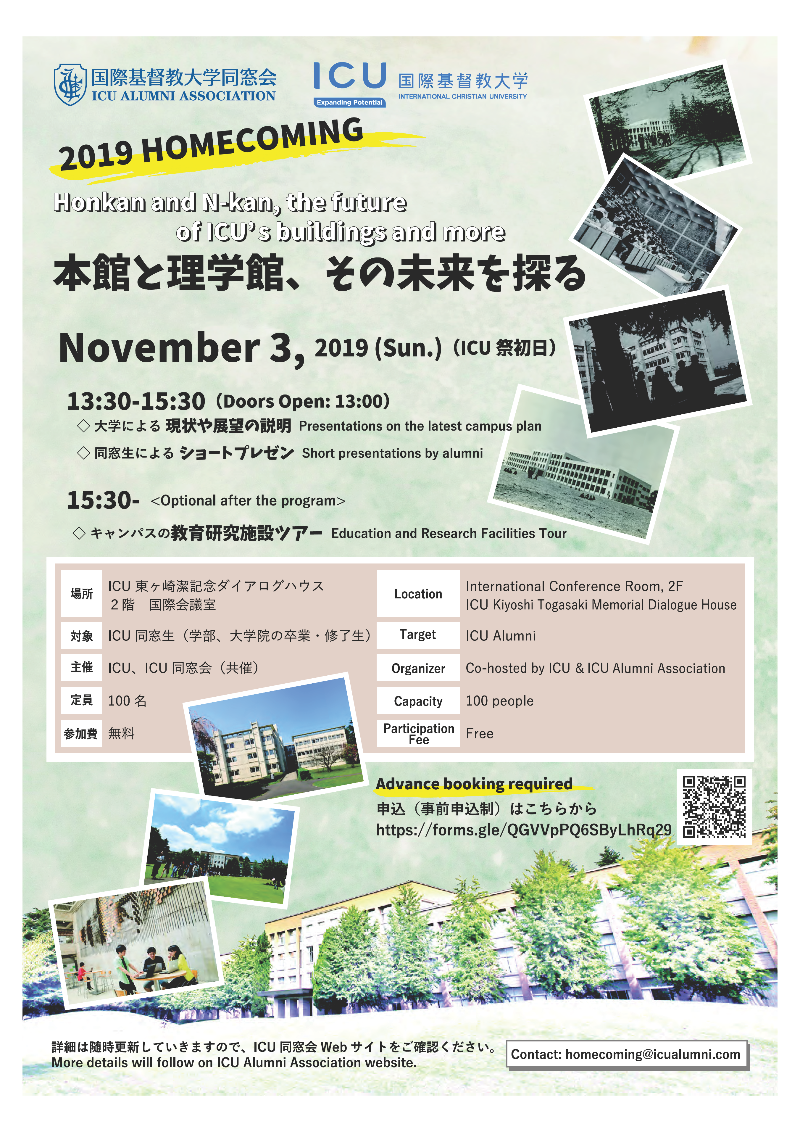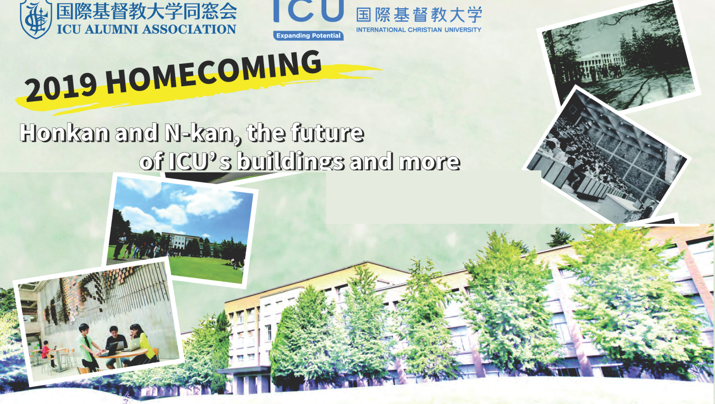 (post on Sept. 30th) This year’s Homecoming theme concerns the buildings that represent the history of ICU such as Honkan and N-kan, where each of you have made many memories. They need various renovations and maintenance for the next generation of students to use them. The program will include presentations on the latest campus plan by ICU and short presentations on a new school building by alumni. It is going to be the homecoming where we think about school buildings for “The University of Tomorrow”. We look forward to seeing you!