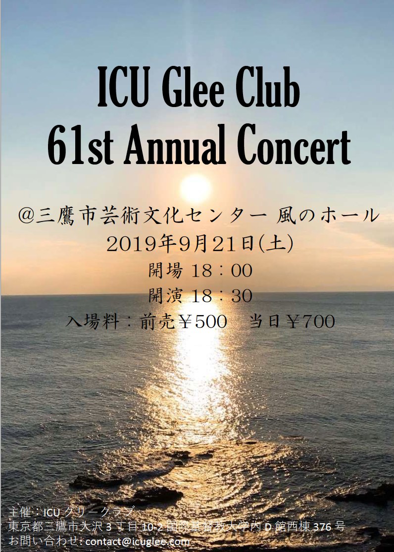 ICU Glee Clubは国際基督教大学献学当初から続く、学内唯一の混声合唱サークルです。今回は61回目の定期演奏会を迎えることとなりました。グリークラブが創部以来歌い継いできた黒人霊歌(Spirituals)、ルネサンス期のスペインの音楽、そして「朝」をテーマにした谷川俊太郎作詩の日本語合唱曲と個性豊かなステージをご用意しました。9月21日(土)、皆様のご来場をお待ちしております。