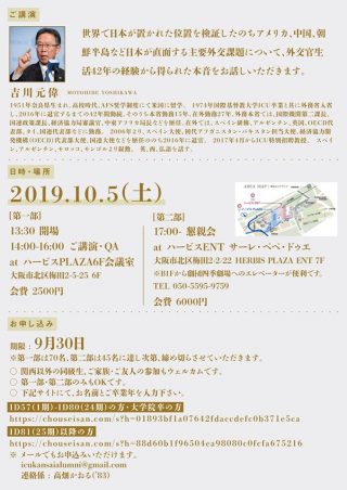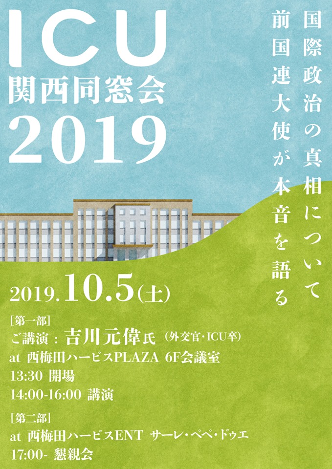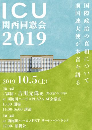 京都・大坂・神戸と三都を巡るICU関西同窓会は今年秋、JR大阪の駅チカ、西梅田で開催します。今回は、ICUでクラスも持っておられる前国連大使の吉川元偉さんにおいでいただけることになりました!一期から最近卒業した方まで幅広く参加いただき、関西らしく笑いの絶えない同窓会ですが、今年はホットなテーマで貴重なお話を聞くことができると存じます。