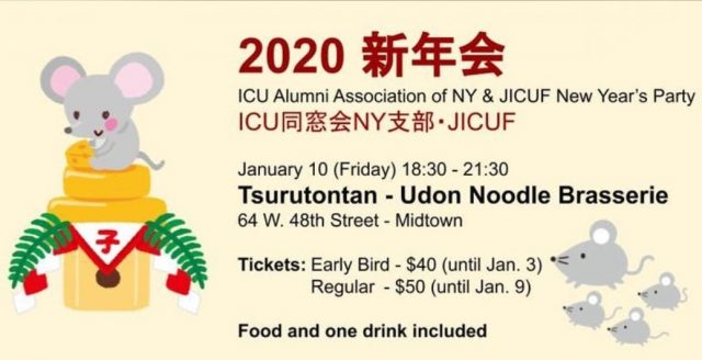 2020年1月10日(金)、同窓会ニューヨーク支部・JICUF(Japan ICU Foundation)共催で新年会を開催いたします。今回の会場はミッドタウンのTsuruTonTan Udon Noodle Brasserie です。コシのあるうどんをつるつる美味しく頂きながら、一緒に新たな年をお祝いしましょう。