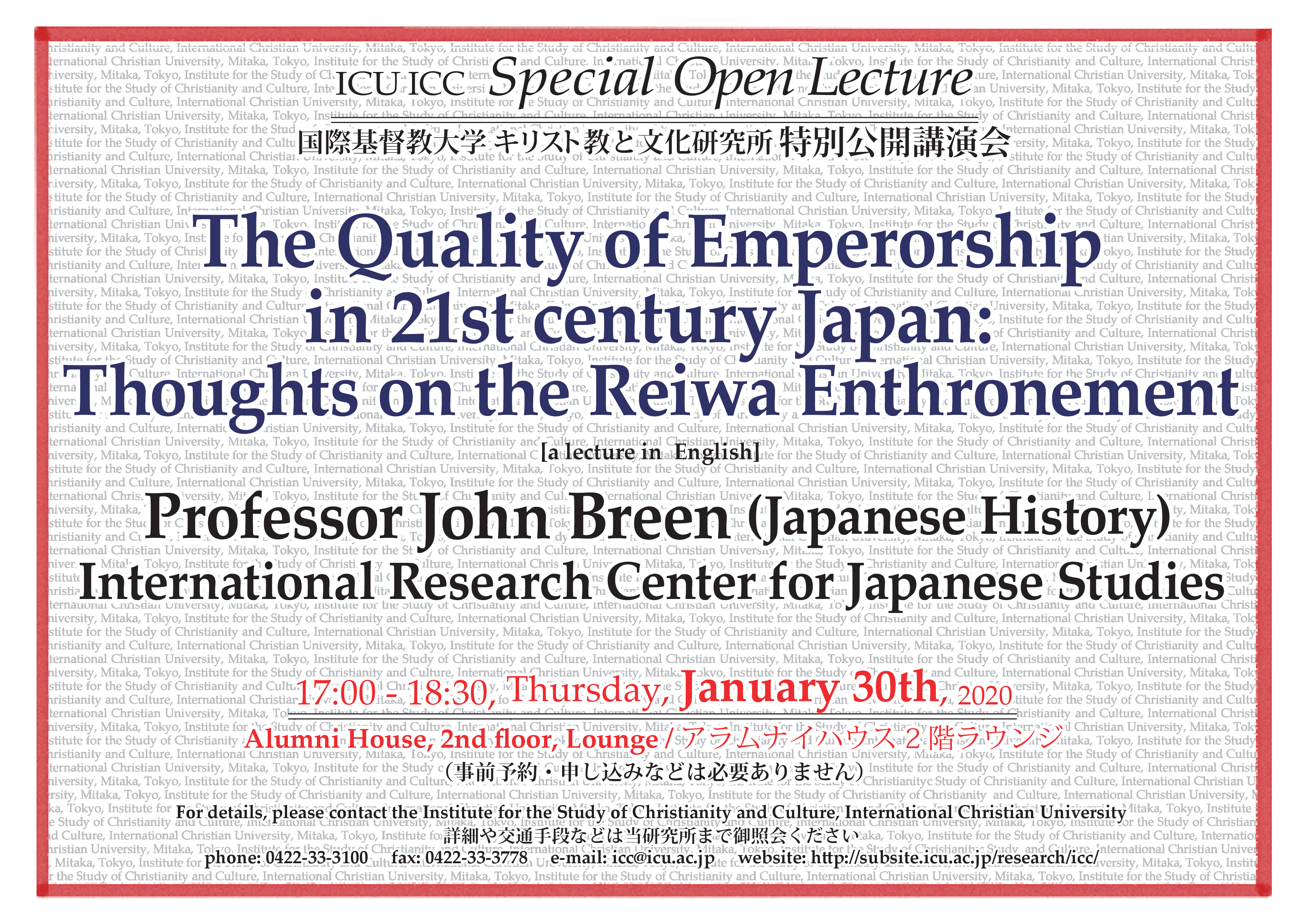 このたび、ICUキリスト教と文化研究所の開催にて、国際日本文化センター教授John Breen先生の公開講演会「The Quality of Emperorship in 21st century Japan: Thoughts on the Reiwa Enthronement」を予定しております。