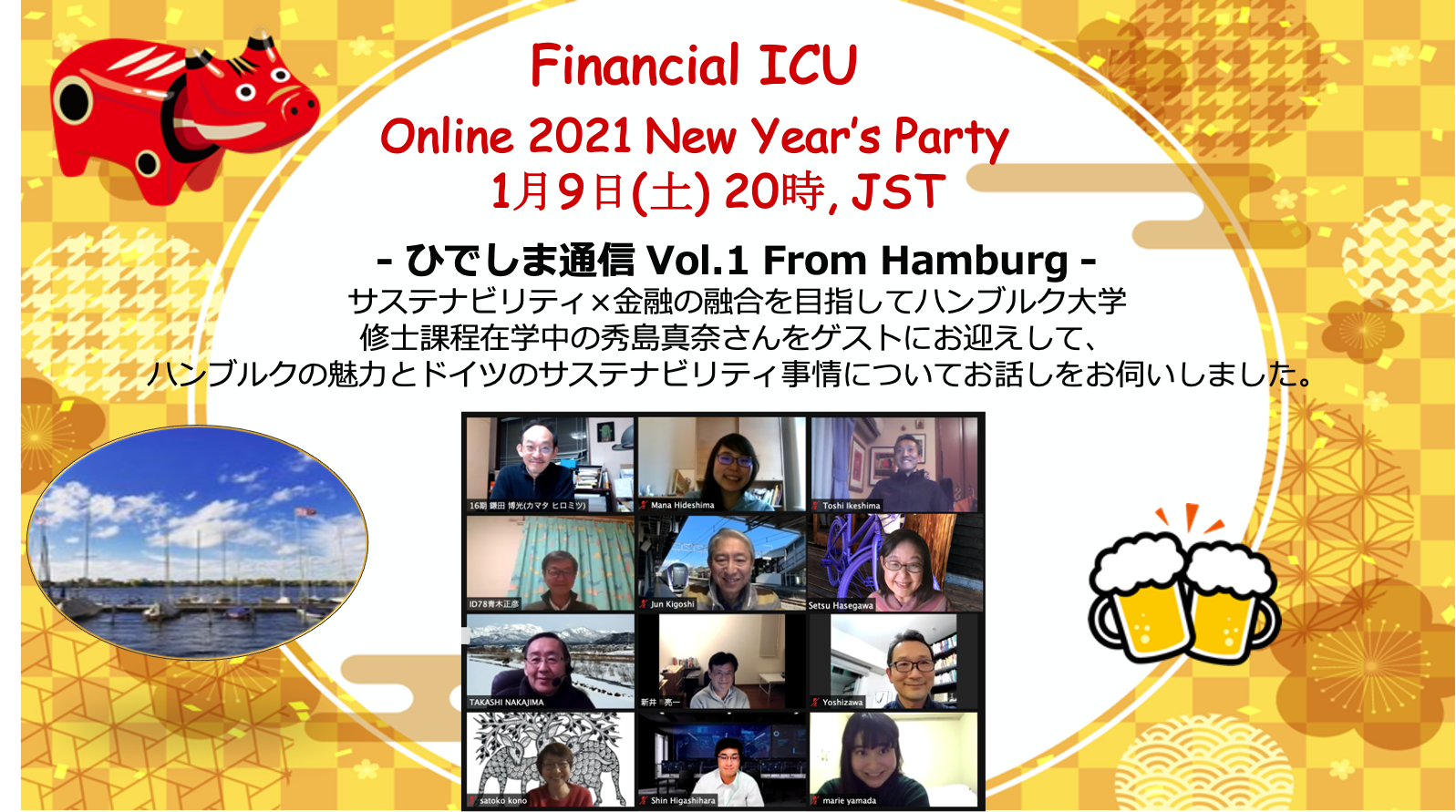 Financial ICU支部では1月9日に13人が参加して「ひでしま通信 Vol.1 From Hamburg」と題し、2020年の10月からハンブルク大学大学院でサステナビリティとビジネスを学ぶ秀島真奈さん(ID18)に現地からお話し頂きました。