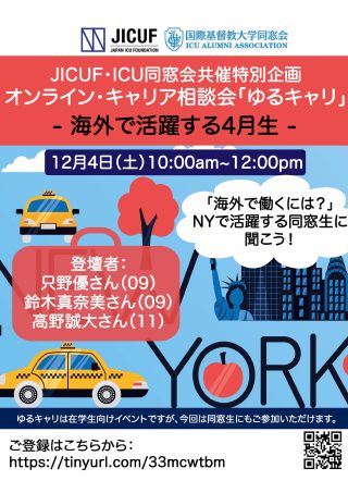 来たる2021年12月4日(土)10:00am-12:00pmに、JICUFとICU同窓会の共催による特別企画であるオンライン・キャリア相談会「ゆるキャリ」ー海外で活躍する4月生ーが開催されます。