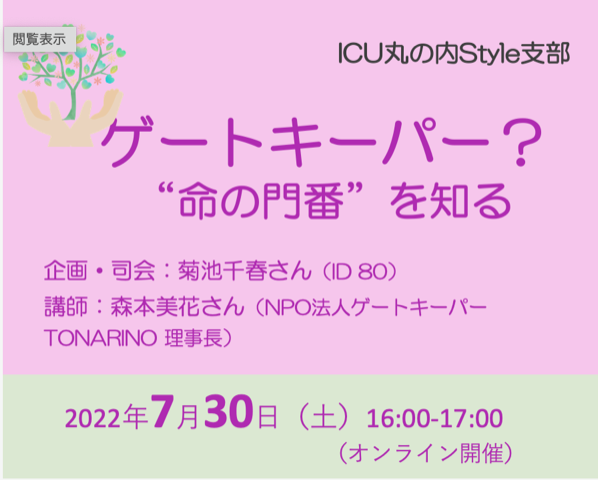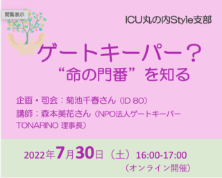 久しぶりのICU丸の内Style支部イベントへのお誘いです。7月30日、「ゲートキーパー?”命の門番を知る”」を開催します(オンライン)。
