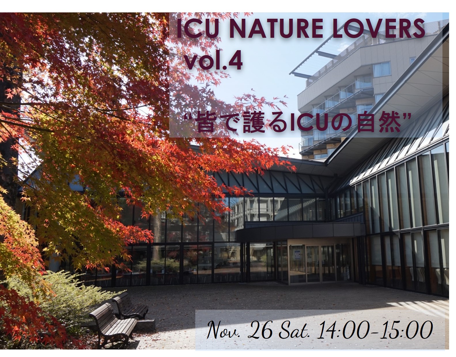 ICU Nature Lovers Vol. 4 “皆で護るICUの自然〜未来に繋ぐために〜” のアーカイヴ映像を期間限定で公開いたします。以下のURLよりご視聴ください。
