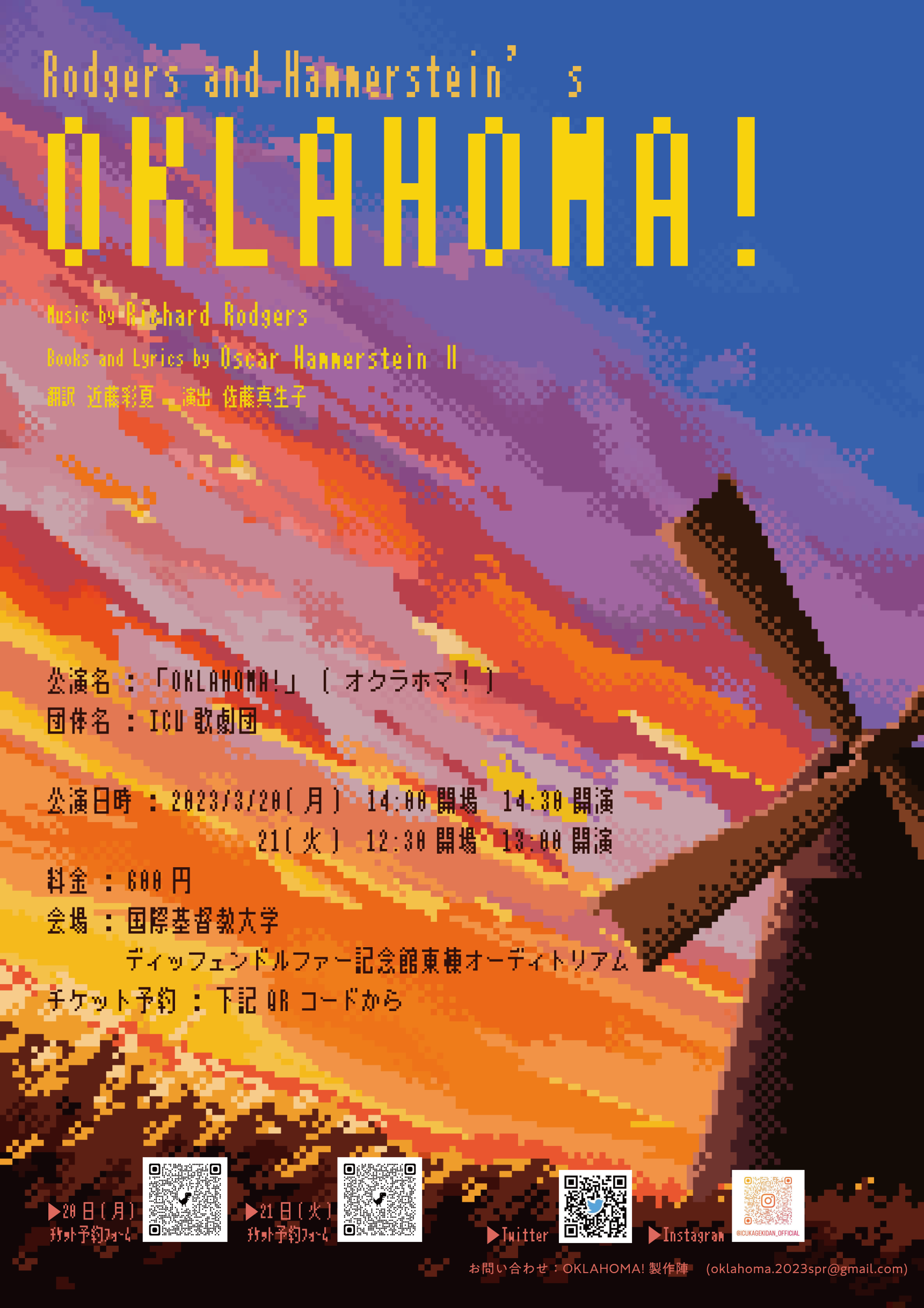 浅春の候、皆様におかれましてはますますご健勝のこととお喜び申し上げます。この度、私どもICU歌劇団は3/20(月)・3/21(火)にオーディトリアムホールにてミュージカル『OKLAHOMA!』を上演いたします。公演詳細は以下をご覧くださいませ。