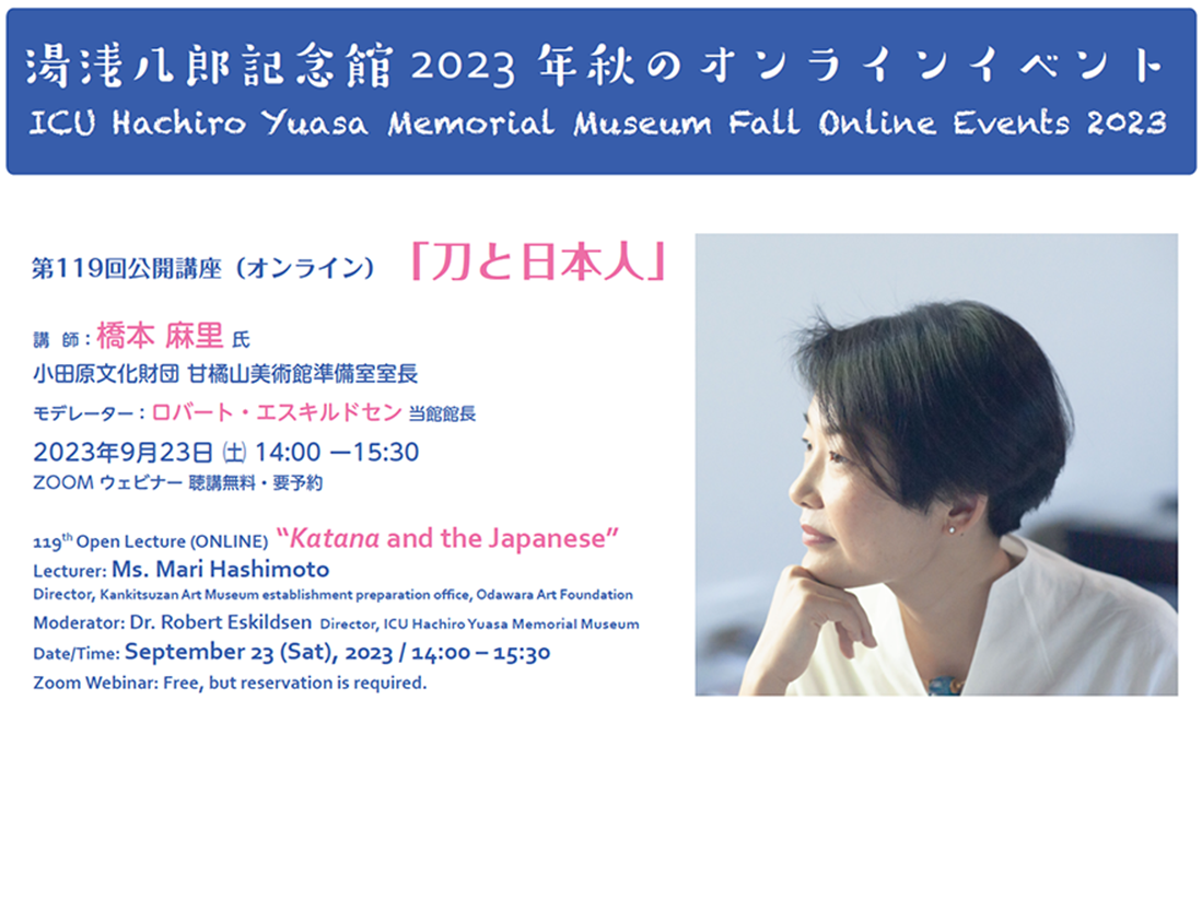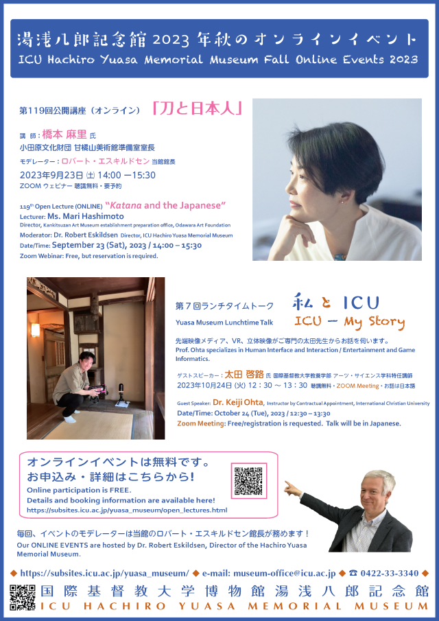 | 申込方法 | 事前予約制(お申込みいただいた方には、後日参加用URLをお送りいたします。) イベント詳細とご登録はこちらから→https://subsites.icu.ac.jp/yuasa_museum/open_lectures.html |