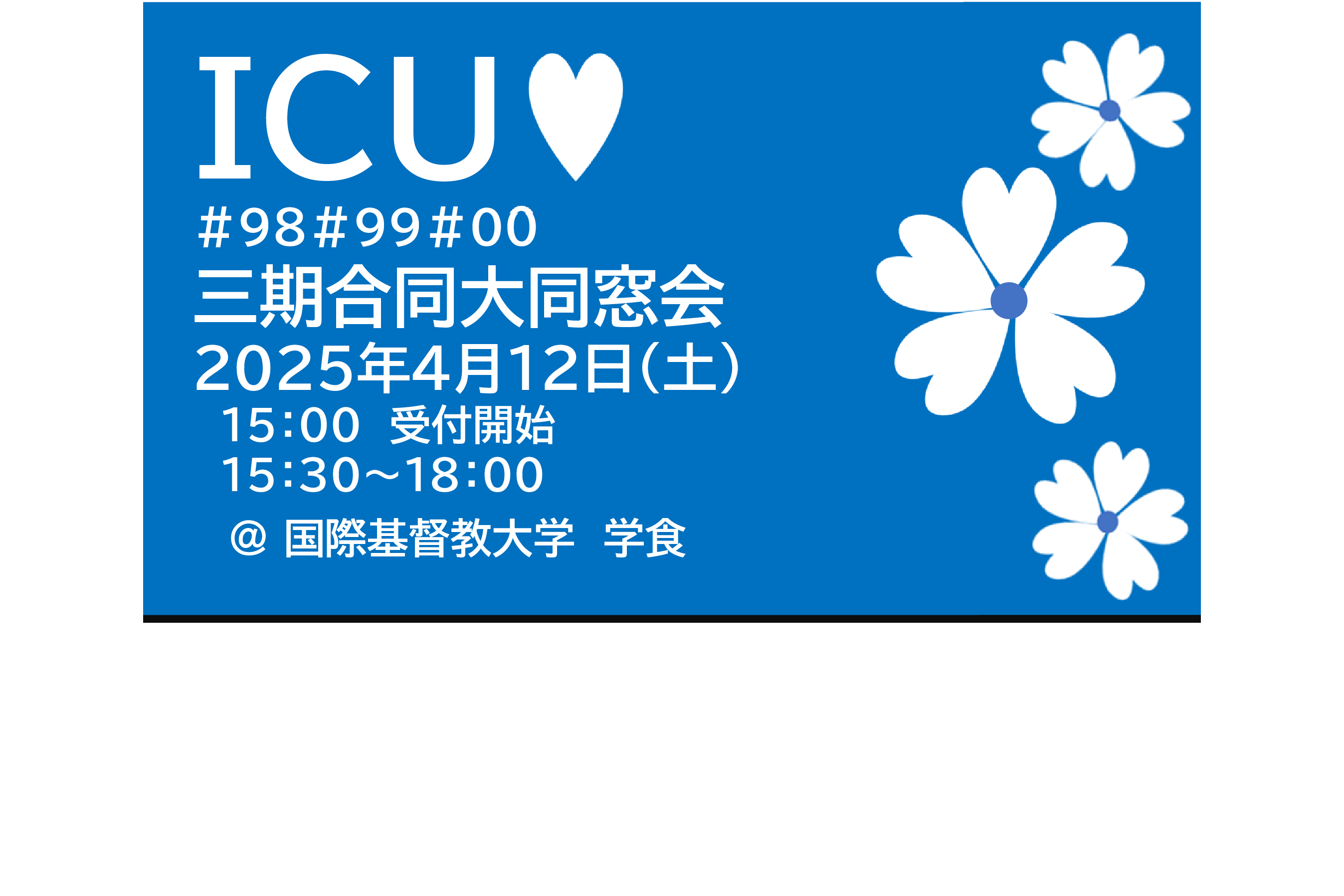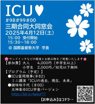 このたび有志で声をかけあい、3期合同の同窓会をICU学食にて開催する運びとなりました。ぜひ周囲の同窓生にもお声がけいただき、ご家族、パートナーの方々とご参加くださいますようお願い申し上げます。