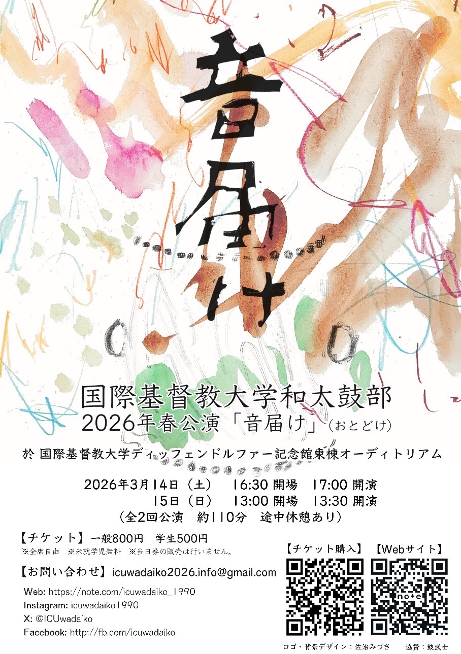 私たち国際基督教大学和太鼓部は、来る3月にディッフェンドルファー記念館(旧D館)東棟オーディトリアムにて、2026年春公演『音届け』を開催いたします。いつもあたたかく応援してくださる家族、友人、そして一緒に太鼓を打つ仲間たちへの感謝の気持ちを胸に。そんなたくさんの人とのご縁を振り返りながら、私たちの音を届けます。皆様のご来場を心よりお待ちしております。