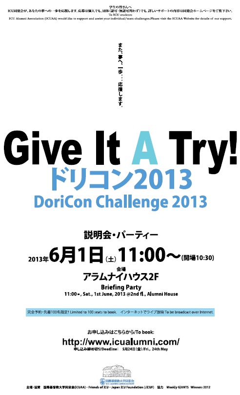 皆さまの夢を同窓会が応援する、2013年、「ドリコン」の説明会は6月1日の開催です。