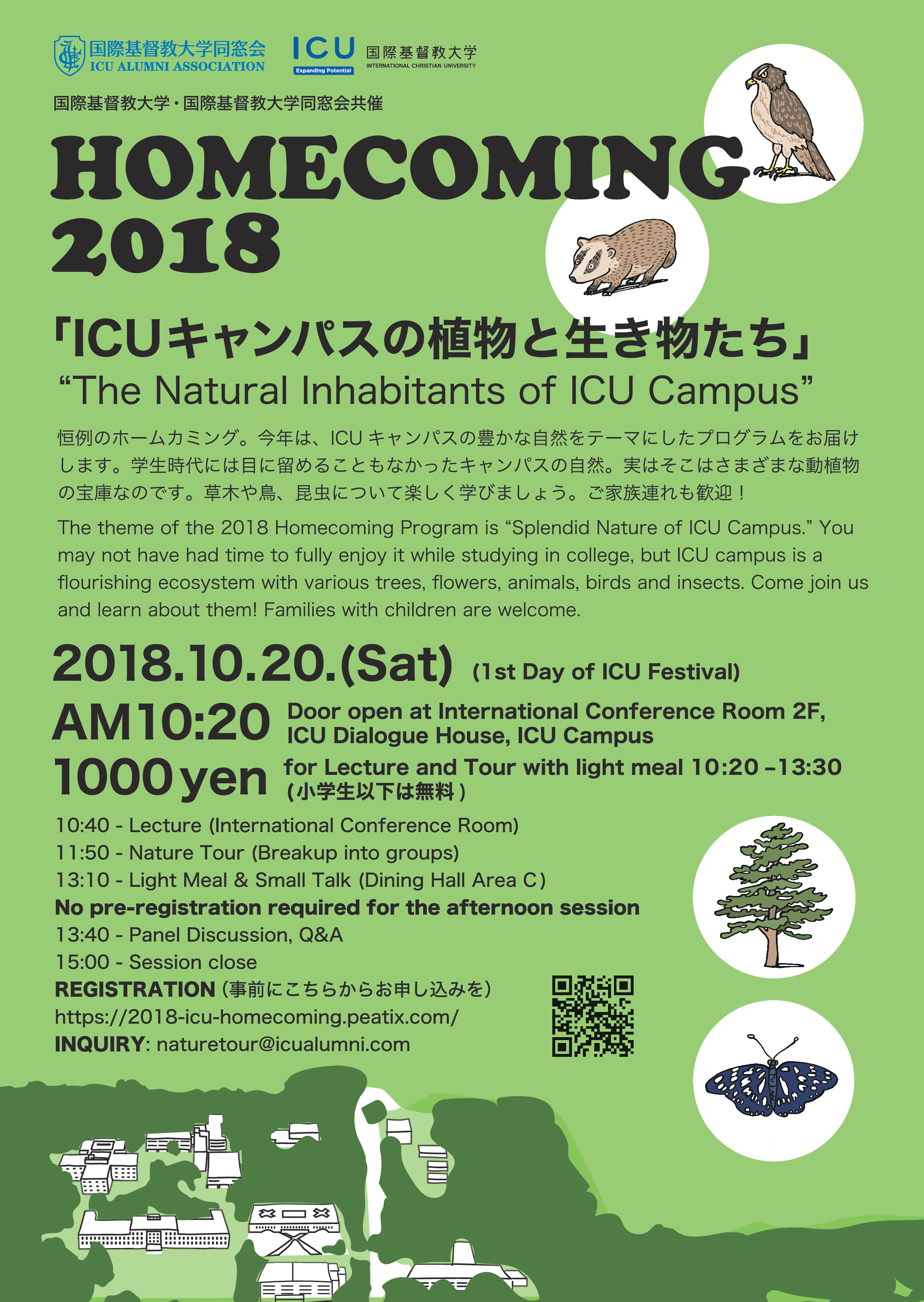 恒例のホームカミング。今年は、ICUキャンパスの豊かな自然をテーマにしたプログラムをお届けします。学生時代には目に留めることもなかったキャンパスの自然。実はそこはさまざまな動植物の宝庫なのです。草木や鳥、昆虫について楽しく学びましょう。ご家族連れも歓迎です!