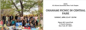 桜の季節、特にICUが恋しくなる時期ですが、ニューヨークの桜を愛でながら思い出話に花を咲かせ、世代を越えた交流をを楽しみましょう。出席可能な場合、こちらのリンクより参加表明をお願いいたします。