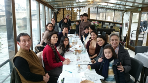 寒波の襲来でパリでも零度前後の日が続きましたがこの日は曇りでしたが寒さがひと段落したようです。19人がセーヌ河に浮かぶ船上レストランLA NOUVELLE SEINEに集まりました。燦然とパリを見守り屹立しているノートルダム大聖堂の南面のバラ窓を目の前にして楽しく懇親の場をもちました。ときに横を通り抜ける観光船の煽りを受けて微かに揺蕩う印象です。初めての方も多くまた知人ご一家なども参加してパリ支部の人の輪が一段と広がっているようです。年に一回の正式な懇親会としての新年会でした。