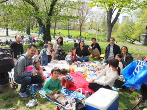4月23日・日曜日の午後、快晴のセントラルパークにて、マンハッタンとニューヨーク近郊に住む同窓生と友人・家族、約30名が集まりお花見の会を開催しました。直前までお天気が心配されていましたが、当日になってみるとこの上ないお花見日和で、それぞれ持参したピクニックブランケットの上にお弁当・お菓子を並べ、和やかに春の一日を楽しみました。集合場所のピルグリム・ヒルの桜は既に葉桜となっていましたが、公園内は様々な種類の樹木が競うように花を咲かせており、美しい季節が到来したことを体感する休日となりました。
