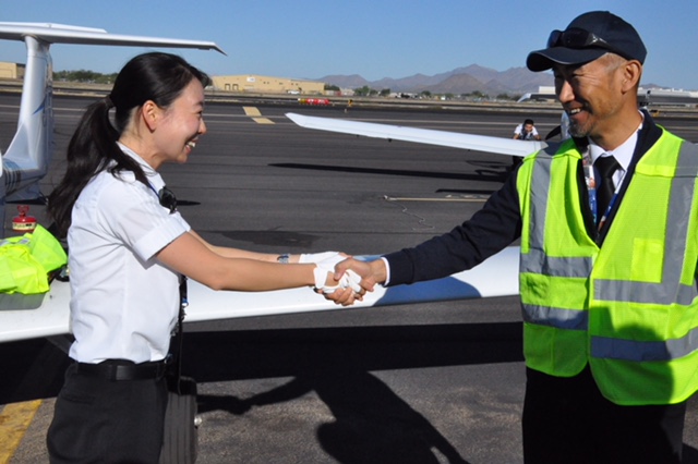 (私たちのクラスを担当してくださった教官と。初ソロフライトを終えた後の握手。
