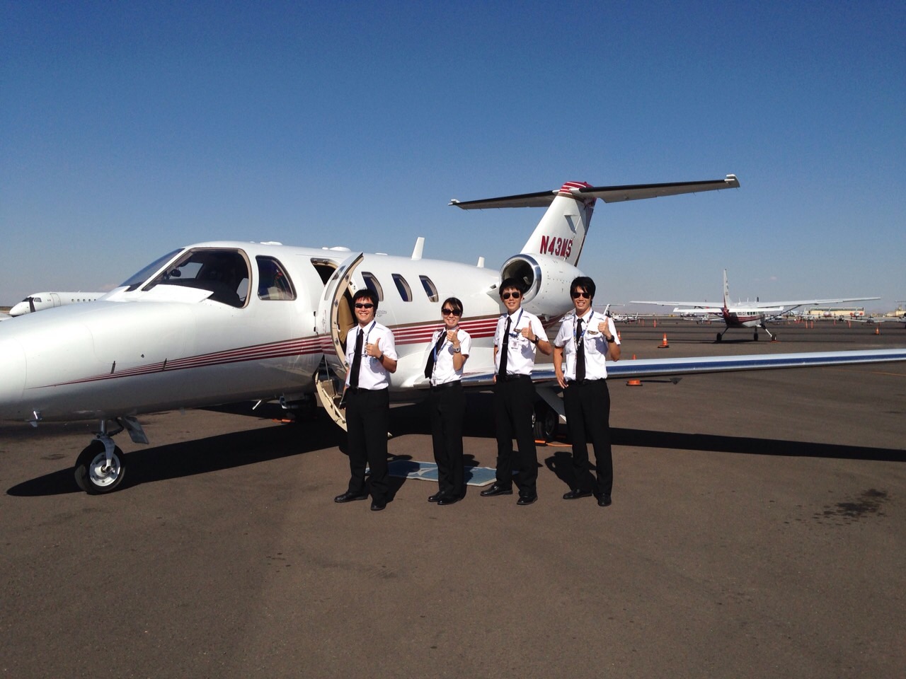 - アリゾナの訓練で、担当教官と初めてジェット機に乗り、厚い雲から抜けた時の感激が忘れられません。真っ白だった視界がパッと開けた時の空があまりに綺麗で、「こんな世界があるんだ」、と恍惚としてしまいました。そのあと地上に帰ってきてから、教官には「お客さま気分は今日までね」とプロとしての自覚を教わりました。