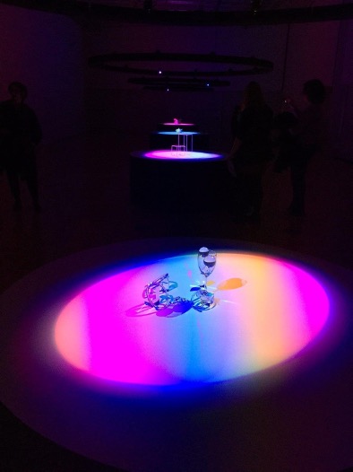 現代アーティスト・シリーズ「トランスフィアvol.1 創意のランドスケープ 真鍋大度+石橋泰」展、パリ日本文化会館ギャラリー、2016年3月~5月、『rate-shadow』の会場風景。肉眼では白色光にしか見えない情景だが、スマートフォンなどを通すと、上記写真のような虹色の光景が現れる新作。