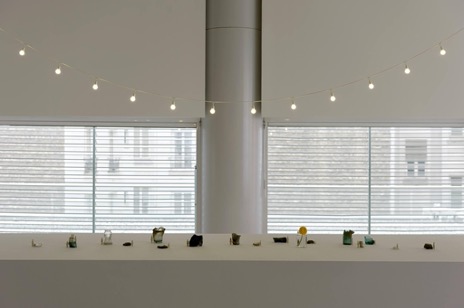現代アーティスト・シリーズ「トランスフィアvol.3 内藤礼 信の感情」展、パリ日本文化会館ギャラリー、2017年1月~3月、会場風景。広島平和記念資料館蔵の被爆瓶17点と親指ほどの木彫の人物『ひと』54点、照明、ガラス瓶に生けた花などで構成され、上記の長さ25mの台座の周囲を天井から糸で吊るした小さな鈴が2.5m間隔で囲っているが、写真では不可視。グレーの絨毯を敷きつめ、観客は靴を脱いで会場に入った。