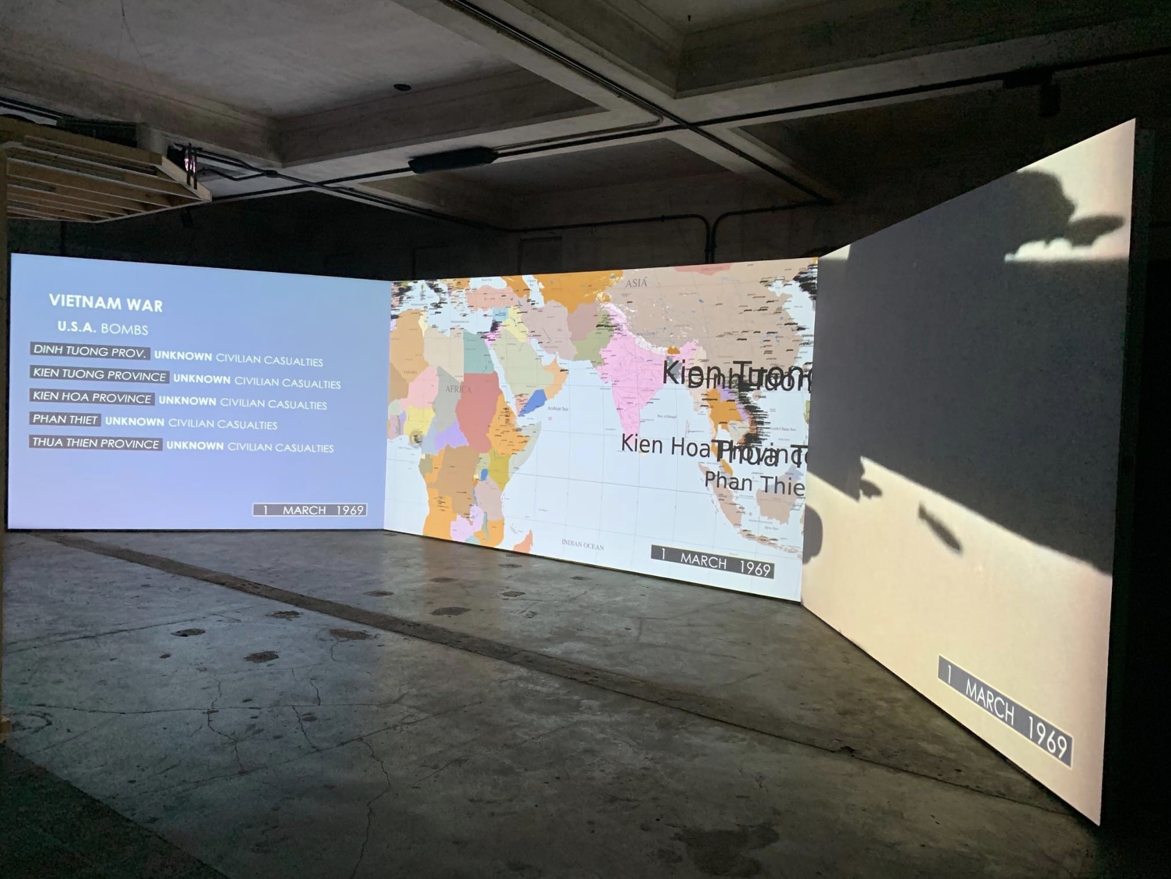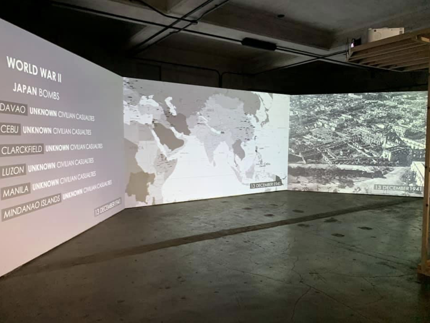 「想起の力で未来を:メタル・サイレンス2019」展、上野旧博物館動物園駅 駅舎、2019年10月から11月。上野文化の杜実行委員会主催。スペインのクリスティーナ・ルカスによる『終わりえぬ閃光』。飛行機が飛び始めてまもなく民間人が犠牲になる空爆が開始。ルカスはゲルニカから発想したこの作品を、ビッグデータを活用し、100人以上の世界中の人たちとコラボレーションして調査、現在に至る6時間以上の3面の映像作品にした。左がどこの国の空爆で何人の民間人をどこで殺戮したか、中央画面が爆撃のあった場所の地図に犠牲者数の大小でドットが現れ、右はそれにまつわる写真。上記のようにすべてが白黒の映像は、広島・長崎に原爆が落ちるまでの時代で、この写真は第二次世界大戦時の日本がアジアの国々に行った空爆。米軍による空爆で亡くなった日本の民間人の犠牲者数は、本展キュレーター岡部が再調査し、訂正かつ補充した。