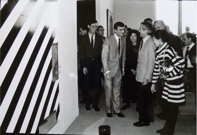 「前衛芸術の日本1910-1970」展 パリ、ポンピドゥー・センター、1986年12月~1987年3月、オープニング、前列右から再制作された『作品(鏡)』とおそろいの服を着た具体の山崎つる子、ジェルマン・ヴィアット、岡部、フランソワ・レオタール文化相、アルフレッド・パックマン ©Centre Pompidou