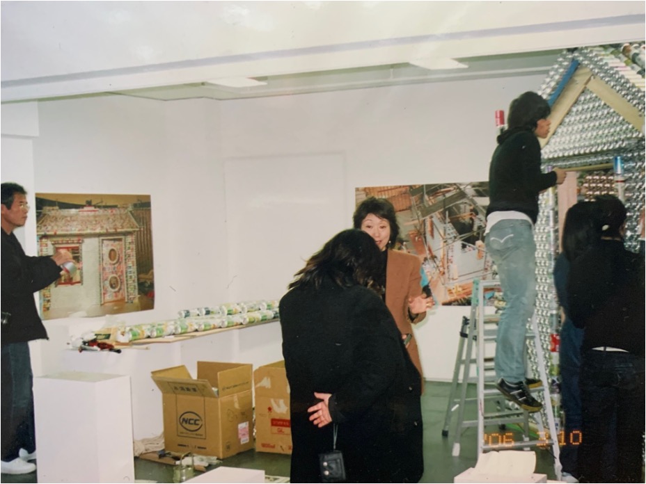 武蔵野美術大学主催αMプロジェクト、「田中偉一郎x増岡巽「夢のマイホーム」展、2006年、設営風景(武蔵野美術大学で教鞭をとっていた時、カルチャーパワーというwebサイトを創設した。http://apm.musabi.ac.jp/imsc/cp/ このサイトの12.Alpha M project2005 に、2005年~06年にかけて企画した全部で14人の作家を扱った計8回の展覧会の情報やインタヴューが掲載されている。写真は7回目。http://apm.musabi.ac.jp/imsc/cp/menu/artist/tanaka_masuoka/intro.html )