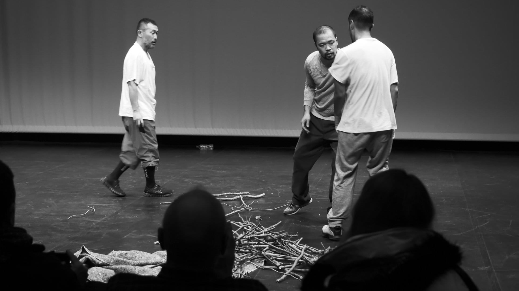 現代アーティスト・シリーズ「トランスフィアvol.7 塚原悠也+コンタクトゴンゾ」展、パリ日本文化会館ギャラリー、2020年1月~3月。関西のパフォーマンス・グループ、コンタクトゴンゾのこれまでの記録映像や新作コラージュ、メンバーの塚原悠也による新作インスタレーションで構成。写真はオープニング時の大講堂でのパフォーマンス。