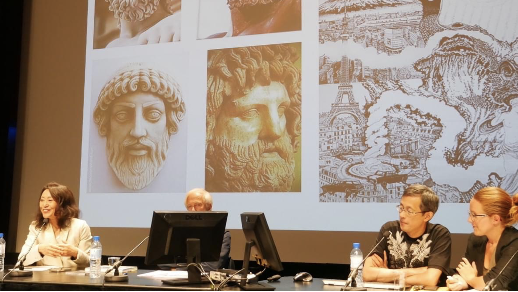 現代アーティスト・シリーズ「トランスフィアvol.6 大岩オスカール+田中麻紀子、カミーユ・フォンテーヌ リオ、東京、パリ:都市とスポーツの祭典」展、パリ日本文化会館ギャラリー、2019年9月~12月。2026年にパリでオリンピックが開催される。その前のリオと東京を含めたオリンピック3都市をテーマとする絵画展。ブラジル生まれの日系ブラジル人大岩オスカールが自ら描いた3都市をの巨大な新作ドローイングの前に立つ。この3点の大作はくっつけて展示すれば絵巻のように連続し、もし縦に並べれば、オリンピックが始まったギリシアの神ゼウスが出現する。裏の壁面には、東京を担当した田中麻紀子の水彩とパリを担当したカミーユ・フォンテーヌの油彩がある。