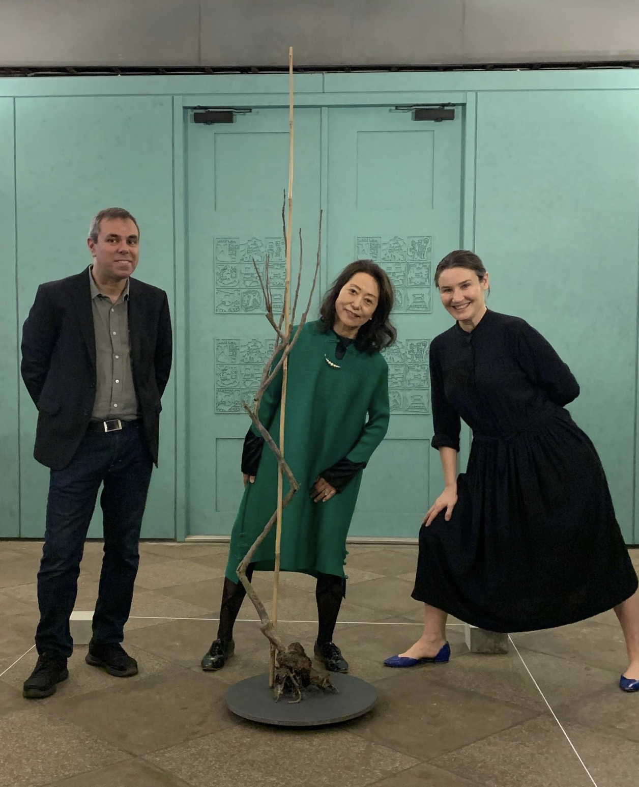 招聘したもう一人のスペインの作家、フェルナンド・サンチェス・カスティーリョによる新作『テューター』。樹木が豊かな上野公園には、米国のグラント夫妻による植樹もある。この会場の前の公園には定期的に炊き出しのためにホームレスの人々が集まる。ブロンズで鋳造された折れ曲がった木は、植樹されても衰えることもある樹木と同様に、社会や環境の変化で生き方が左右される人間のありようを象徴している。左がカスティーリョ、右がルカス。