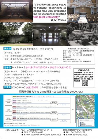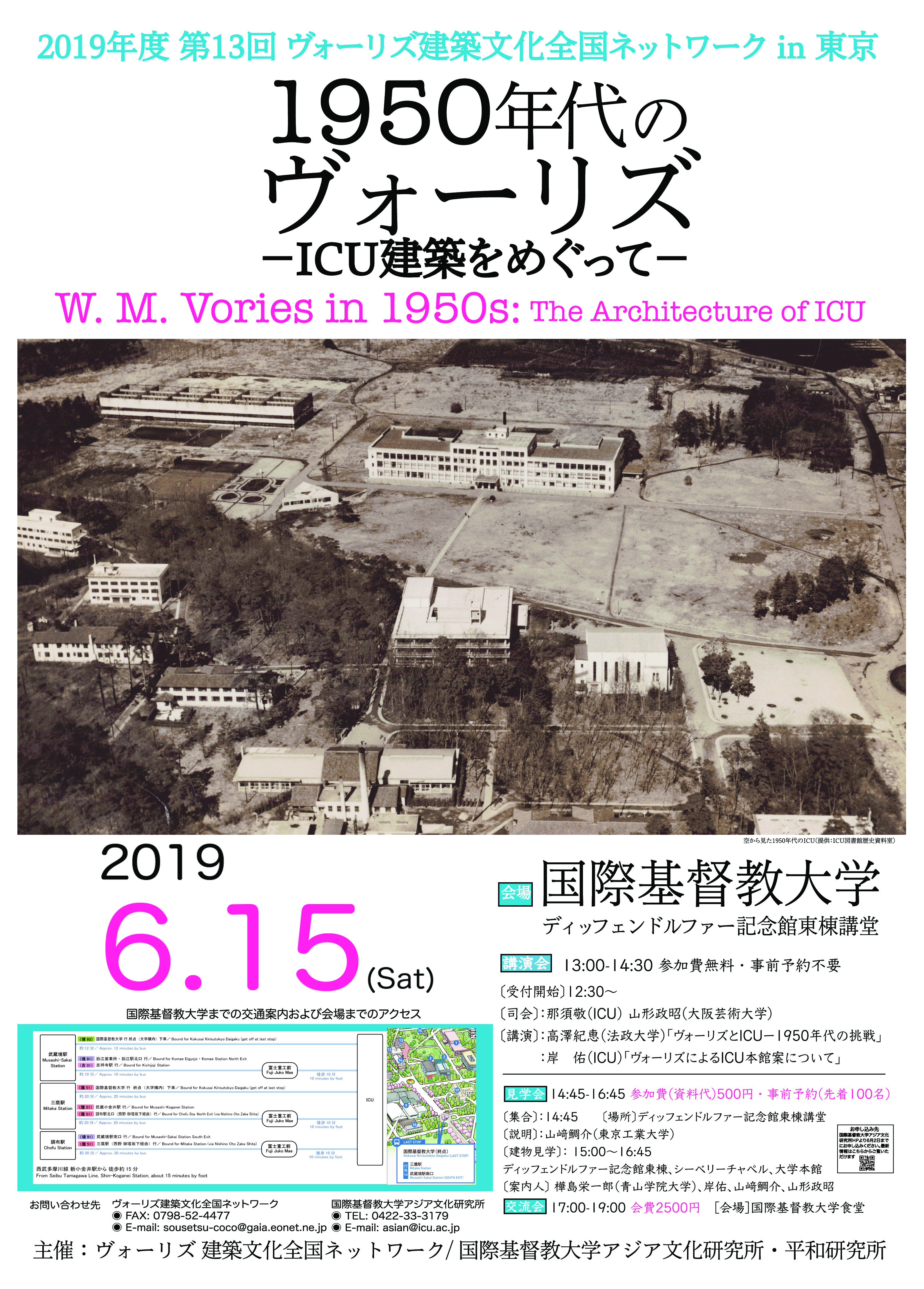 この度、アジア文化研究所では平和研究所、ヴォーリズ建築文化全国ネットワークとの共催で「1950年代のヴォーリズ:ICU建築をめぐって」を開催する運びとなりましたので、お知らせいたします。