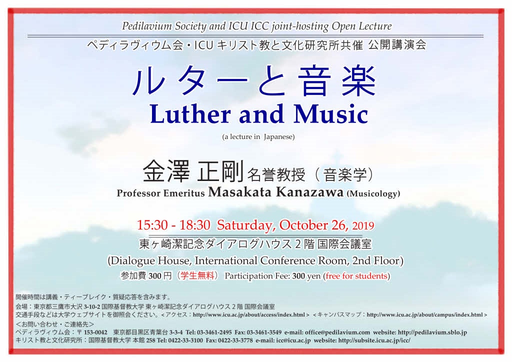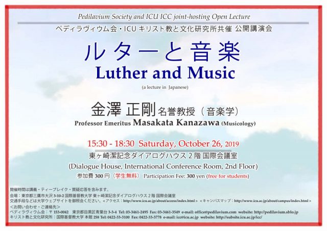 このたび、ペディラヴィウム会・ICUキリスト教と文化研究所の共催にて、ICU名誉教授金澤正剛先生の公開講演会「ルターと音楽」を予定しております。