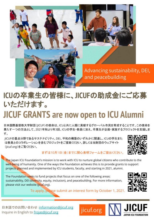JICUF(日本国際基督教大学財団)は2016年より、ICUの学生・教員の様々な活動を支援するため、助成金プログラムを運営して参りました。昨年春、ICUがオンライン授業に移行し、国の内外での移動が困難になったことを受け、プログラムを一時休止しましたが、この秋に再開する運びとなりました。休止期間にプログラムを見直し、より良いものにするためいくつかの変更を加えましたが、その一つが、ICUの卒業生にも助成金を申請していただけるようにすることでした。