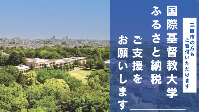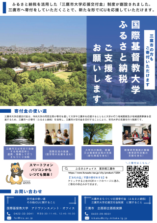 この度、ICUはふるさと納税を活⽤した「三鷹市⼤学応援交付⾦制度」の対象⼤学になりました。ご寄付は毎年 1-12 ⽉(2024 年度は 7-12 ⽉)に、ふるさと納税ポータルサイト(ふるさとチョイス)あるいは三鷹市企画部企画経営課窓⼝での寄付申出書により受け付けます。 三鷹市まちづくり応援寄付⾦(ふるさと納税)は、三鷹市在住の皆さまもご寄付いただけます。