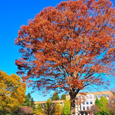 「秋学期最後の週の早朝にとったものです。1年生から愛用している一眼レフカメラをもって、静かな学内を散歩していました。ICU祭が終わり、何か喪失感のようなものを感じていましたが、学内のいたるところで目にする様々な木々の紅葉と真っ青な空に、心がすーっと晴れていったのを覚えています」