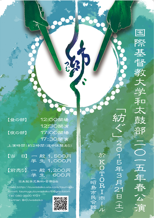 国際基督教大学和太鼓部は、来る3月に 2015年春公演「紡ぐ」を下記の通り開催致します。 打ち手一同、皆様のご来場を心よりお待ちしております。