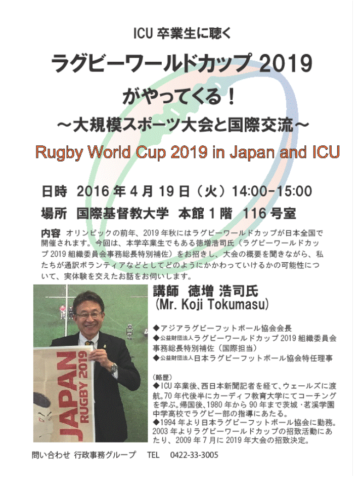 オリンピックの前年、2019 年秋にはラグビーワールドカップが日本全国で開催されます。今回は、本学卒業生でもある徳増浩司氏(ラグビーワールドカップ2019 組織委員会事務総長特別補佐)をお招きし、大会の概要を聞きながら、私たちが通訳ボランティアなどとしてどのようにかかわっていけるかの可能性について、実体験を交えたお話をお伺いします。学生・教職員のみならず、同窓生の皆様のご参加もお待ちしております。事前申し込みは不要です。