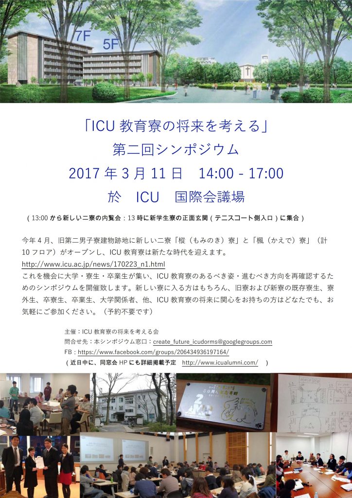 これを機会に大学・寮生・卒業生が集い、ICU 教育寮のあるべき姿・進むべき方向を再確認するためのシンポジウムを開催致します。新しい寮に入る方はもちろん、旧寮および新寮の既存寮生、寮外生、卒寮生、卒業生、大学関係者、他、ICU 教育寮の将来に関心をお持ちの方はどなたでも、お気軽にご参加ください。(予約不要です)