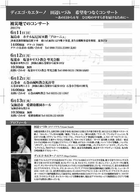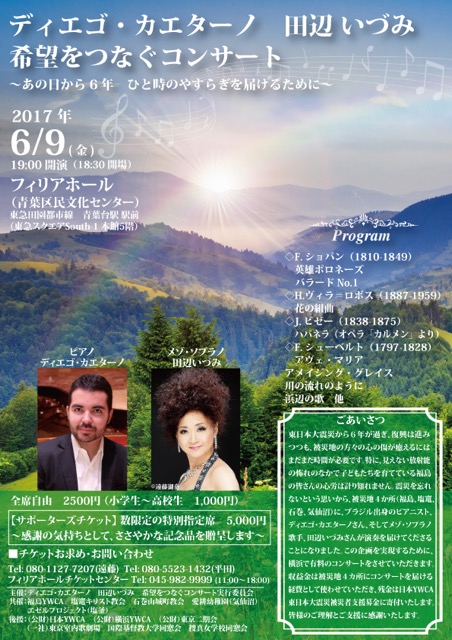 東日本大震災から6年が過ぎ、復興は進みつつも、被災地の方々の心の傷が癒えるには未だ時間が必要です。特に、見えない放射能の怖れの中で子供達を育てている福島の皆さんの心労は測り知れません。震災を忘れないという思いから、被災地4か所(福島、塩釜、石巻、気仙沼)に、世界で活躍するブラジル出身のピアニスト、Diego Caetanoさん、そしてICU卒業で、ソリストとして数々のオペラや、幾多のICU OGC合唱団との共演でお馴染みのメゾ・ソプラノ歌手、田辺いづみさんが演奏を届けてくださることになりました。この企画を実現するために、3期から22期までのICU卒業生有志が、交通至便の横浜で有料のコンサートを実施いたします。その収益金は被災地4ヶ所にコンサートを届ける経費として使わせて頂き、残金は日本YWCA東日本震災被災者支援基金などに寄付いたします。皆様のご理解とご支援に感謝します。