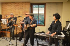 「D館ツアー」に続き、アラムナイハウスで祝賀会が開かれ、木越同窓会会長(27期)の乾杯の挨拶の後、D館族だった同窓生のバンドグループ「Dos Quoiz con Amigo(ドスコイズ)」による演奏が流れるなか、D館話しに花が咲き、最後は軽快なバンドの伴奏に乗った、元気よいICUソングの歌声で締めくくられました。