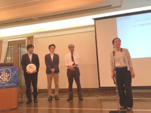次に『湯浅細木記念奨学金』貸与式が2名の学生に対して行われ、先般設立された51番目と52番目の支部であるフライングディスク支部(支部長:斎藤勇太さん・57期)とパプース支部(支部長:鴛淵泰三さん・23期)に同窓会旗の貸与が行われました。
