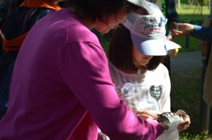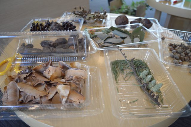 事前申し込みの有料イベントでしたが、予想を超える約90名の申込みと大人気(大人 62名、子供と乳幼児 30名)、同窓会、大学職員、先生方と現役学生の合同準備チームはフル回転。雨天にも備えてキャンパスから集めた多種多様な落ち葉や木の実、周辺で命を落とした小動物の毛皮まで、充実の展示物で皆様をお迎えしました。