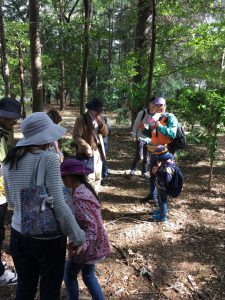 興味深いお話で会場の参加者の期待が最高潮に高まったところで、いよいよ野外観察へ。「アナグマ」「オオタカ」「オオムラサキ」「レバノンスギ」の4グループに分かれ、両先生を含むリーダーの後について、いざ出発です。