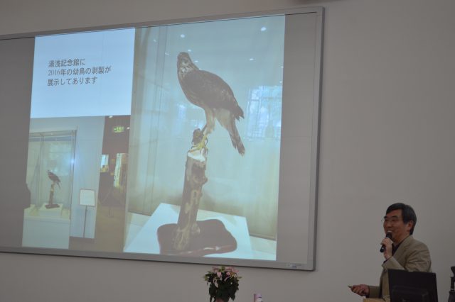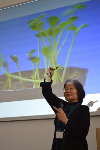 午前はダイアログハウス国際会議室で風間晴子名誉教授と上遠岳彦自然科学デパートメント教員による、キャンパスの植物と生き物たちのご紹介。風間先生からは、キャンパスは1,000種あまりの植物が生息する豊かな自然に恵まれているものの、さまざまな要因により姿を消した種もあるとのお話があり、上遠先生からはアナグマやタヌキのキャンパスでの暮らしぶりを動画もまじえて見せていただきました。